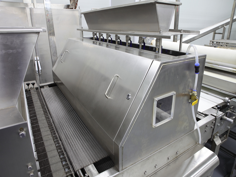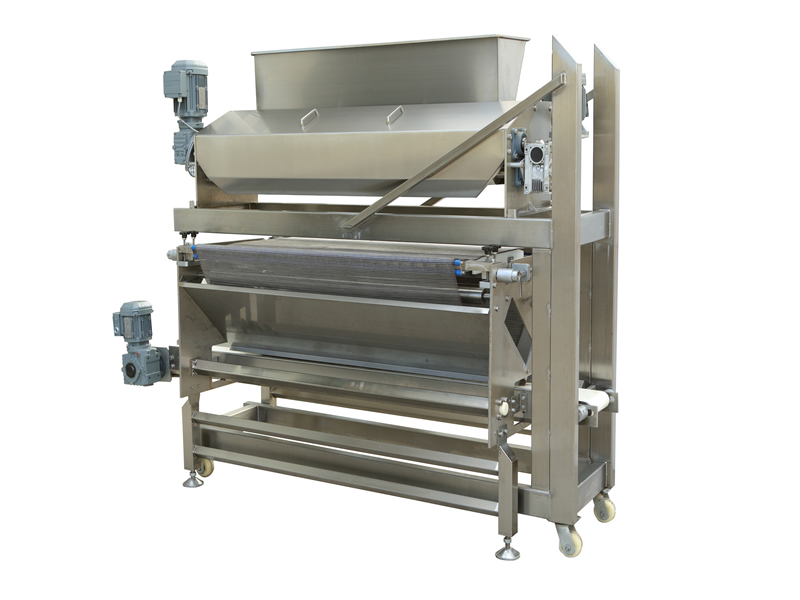 該設備應用于將固體顆?;蛘叻蹱钫{味料,鹽,糖,芝麻及果仁片等撒布在面皮或則餅干上?;厥諜C回收多余的撒布物料循環利用。